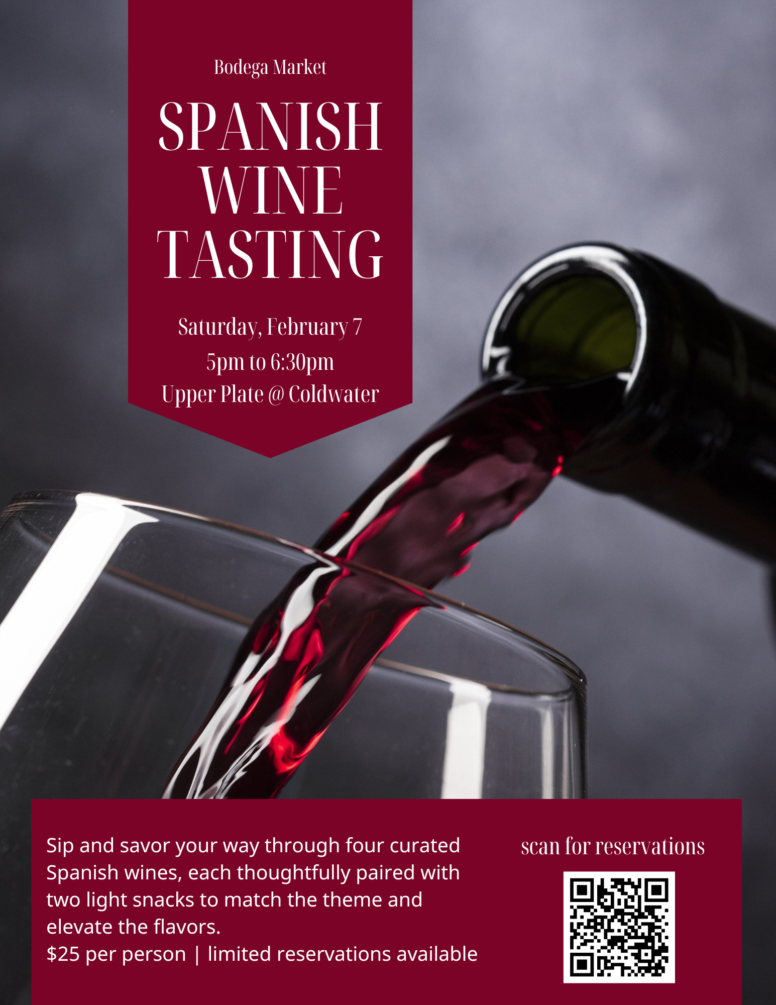 Join us for a relaxed evening upstairs at The Upper Plate as we explore four Spanish wines, each thoughtfully selected and paired with light bites that complement the flavors and reflect the region.